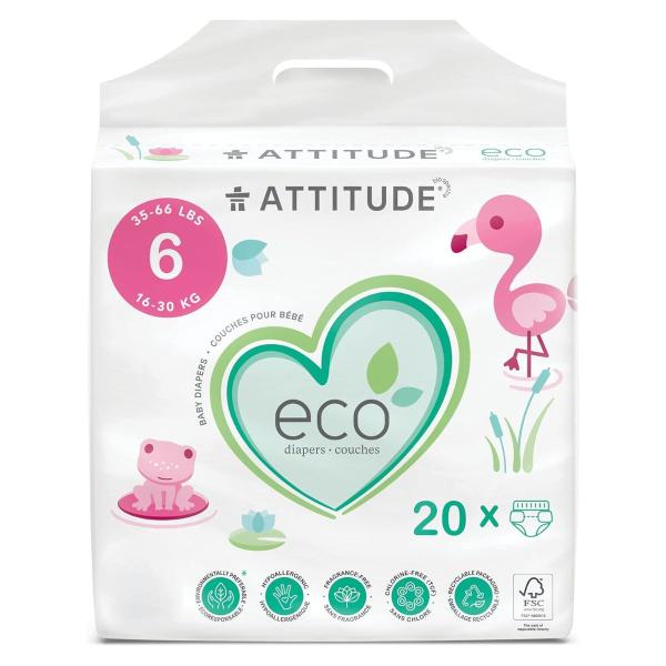 Véritable solution de rechange aux couches jetables traditionnelles, les couches ATTITUDE utilisent plus de 50% de matières premières biodégradables et sont testées dermatologiquement, sans chlore, sans fragrance et sans colorant. Bien entendu, elles sont aussi efficaces, absorbantes et confortables - de jour comme de nuit. Nos couches biodégradables taille 6 conviennent aux bébés de 16 à 30kg (35 à 66 livres).