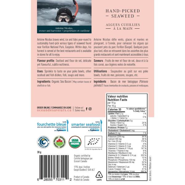- Avec son goût légèrement fumé et salé, notre Bacon de mer rappelle celui de la viande cuite ou grillée (d’où le nom bacon de mer). Dans les Maritimes, on la sert également en guise de grignotine pour accompagner l’apéro. Sa saveur étant bien balancée, cette variété d’algue est probablement la plus accessible à la fois pour les néophytes, ou les sceptiques!