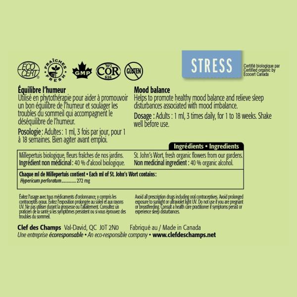 la motivation. Son mode d’action est complexe; quelques- uns de ses constituants augmentent les niveaux de certains neurotransmetteurs (sérotonine, noradrénaline, dopamine, GABA) en inhibant leur dégradation et leur recapture. L’hypéricine est un inhibiteur de la monoamine oxydase (IMOA), comme plusieurs médicaments employés pour la dépression. Le millepertuis réduit l’anxiété, la nervosité, l’irritabilité, l’agitation nerveuse et favorise la stabilité émotionnelle. Le millepertuis a aussi des effets sédatifs légers. Il augmente les niveaux de mélatonine pendant la nuit et, combiné à la tisane de mélisse, est efficace contre l’insomnie. Il a des effets nootropiques et est employé lors de troubles d’anxiété généralisée et de troubles obsessionnels compulsifs. Il augmente la libido. Le millepertuis a aussi une action marquée sur les crampes et les douleurs associées à la tension musculaire. Il soulage les crampes menstruelles, l’irritabilité et l’anxiété liées au syndrome prémenstruel et à la ménopause, les douleurs névralgiques, les spasmes, les tensions musculaires et les douleurs chroniques comme la fibromyalgie. Il est anti-inflammatoire, prévient l’accumulation d’acide lactique dans les muscles et réduit les courbatures dues à l’effort physique. Le millepertuis améliore donc l’endurance chez les athlètes. On l’emploie dans le traitement de l’herpès (labial et génital) et du zona, car il agit à la fois sur le virus et sur la douleur des nerfs. Hypericum perforatum agit sur la vessie et les voies urinaires. Il est employé pour l’énurésie chez les enfants et lors de douleur, d’irritation et de spasmes des voies urinaires. Le millepertuis est antibactérien, antifongique et favorise la cicatrisation des tissus. Les principaux constituants du millepertuis sont des naphtodianthrones (hypéricine, pseudohypéricine) phloroglucinols (hyperforine, adhyperforine), flavonoïdes (hypérine, hypéroside, isoquercétine, kaempférol, lutéoline), acides phénoliques (caféique, chlorogénique, férulique), tanins, procyanidines, caroténoïdes, phénols et huiles volatiles.