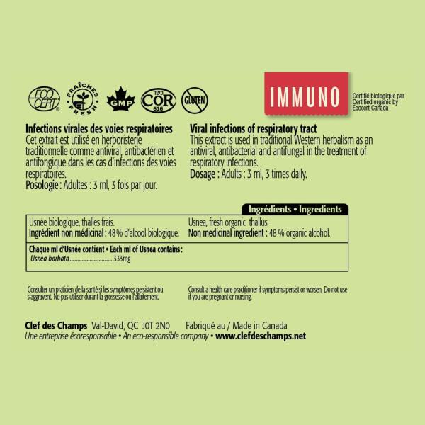 Plante antimicrobienne à large spectre, antivirale, l’usnée possède une affinité particulière pour la sphère broncho-pulmonaire. En plus d’offrir une protection contre les agents pathogènes, elle agit sur les muqueuses des bronches pour calmer et soulager l’irritation. Elle améliore l’élasticité des tissus, relaxe les muscles lisses des bronches et favorise l’expectoration. Utilisée dès les premiers symptômes d’irritation ou d’infection des voies respiratoires, l’usnée a un effet protecteur sur les bronches chez les individus ayant une fragilité pulmonaire. Elle aide à combattre l’infection, fortifie l’immunité et réduit les risques de complications liés au rhume telles que bronchite et sinusite. Antipyrétique, l’usnée est utile lorsque l’infection est accompagnée de fièvre. L’action antibactérienne de l’usnée, en grande partie attribuable à l’acide usnique, est particulièrement efficace sur les bactéries Gram-positif telles que streptocoque et pneumocoque. La combinaison des mucilages et des composés phénoliques de l’usnée en font une plante de choix pour traiter les infections à streptocoque de la gorge. Elle agit aussi sur certaines souches de bactéries Gram-négatif (H. pylori, E. coli) logées dans le système digestif. Analgésique et antivirale, l’usnée est active sur plusieurs virus, dont ceux de l’herpès simplex et d’Epstein-Barr. En usage topique, on l’utilise pour les affections de la peau causées par Staphylococcus Aureus. L’usnée contient des acides : usnique, diffractaïque, lichénique, barbatique, lobarique, principaux constituants actifs et responsables de ses propriétés antibiotiques. Elle contient également des polysaccharides, des mucilages, des principes amers, des acides gras essentiels (linoléique, oléique et arachidonique), des stérols, des acides aminés et des vitamines (C, carotène). Fongicide, l’usnée est intéressante lors d’affections fongiques du système génito-urinaire. Chez la femme, on l’utilise dans le traitement des vaginites à levures et à Trichomonas vaginalis, en usage interne et externe. On emploie l’usnée dans le traitement de cystite d’origine fongique et lors de dysbiose intestinale causée par Candida Albicans ou certains parasites intestinaux. Anti-inflammatoire, elle contribue à réduire les symptômes liés aux troubles inflammatoires de l’intestin.