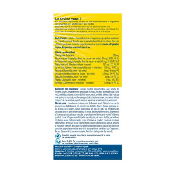 Découvrez DigestMORE® HCl de Renew Life, une formule complète qui combine enzymes digestives d’origine végétale et chlorhydrate (HCl) de bétaïne, afin de soutenir la digestion optimale des protéines, glucides et lipides. Conçu pour réduire l’inconfort lié aux ballonnements, aux gaz et à la digestion difficile, ce supplément favorise un équilibre digestif sain et contribue à maintenir un niveau d’acidité gastrique adéquat.