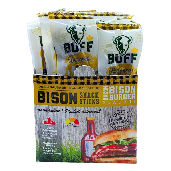 BUFF – Bâtonnets de bison “Bacon Bison Burger” (twin pack 50 g) : saucisse sèche artisanale fermentée et fumée à froid, riche en protéines, au goût BBQ fumé avec une touche de bacon/mesquite. Format pratique à emporter, 100 % canadien. Sans nitrites ni nitrates ajoutés, sans gluten, sans soya ni produits laitiers.