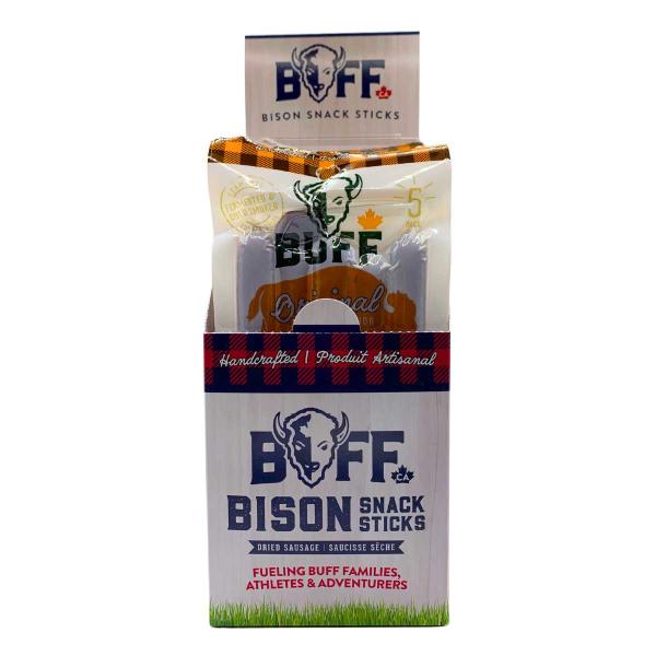 BUFF – Bâtonnets de bison “Bacon Bison Burger” (twin pack 50 g) : saucisse sèche artisanale fermentée et fumée à froid, riche en protéines, au goût BBQ fumé avec une touche de bacon/mesquite. Format pratique à emporter, 100 % canadien. Sans nitrites ni nitrates ajoutés, sans gluten, sans soya ni produits laitiers.