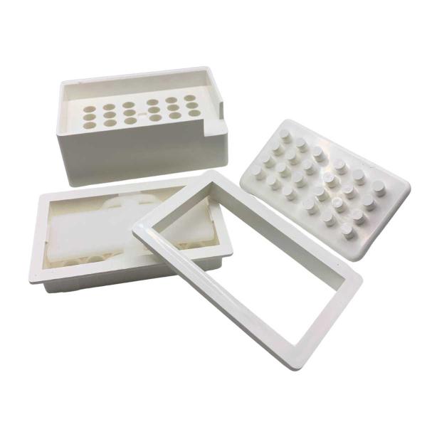 Inclus : base, dessus, support, tasseur (tamper), carte d’étalement (spreader card) et sachet déshydratant.