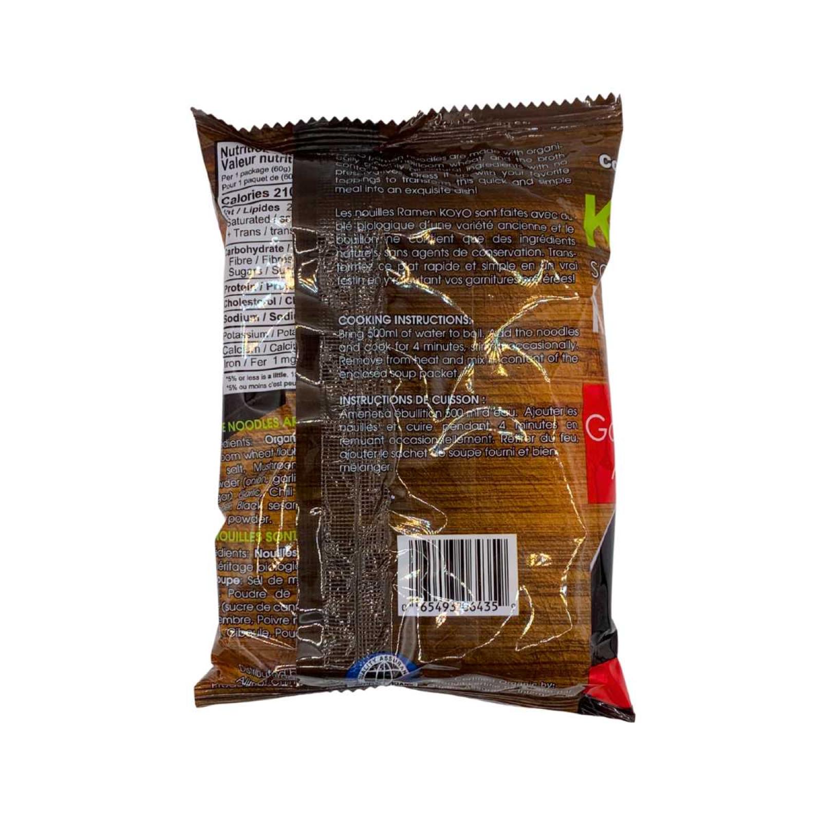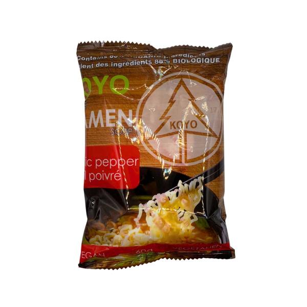 Un bol qui a du punch ! KOYO – Ramen Ail & Poivre marie des nouilles biologiques cuites au four (non frites) à un bouillon relevé d’ail, de poivre noir et d’épices. Sachet 60 g, végétalien, pratique pour un repas express à garnir.