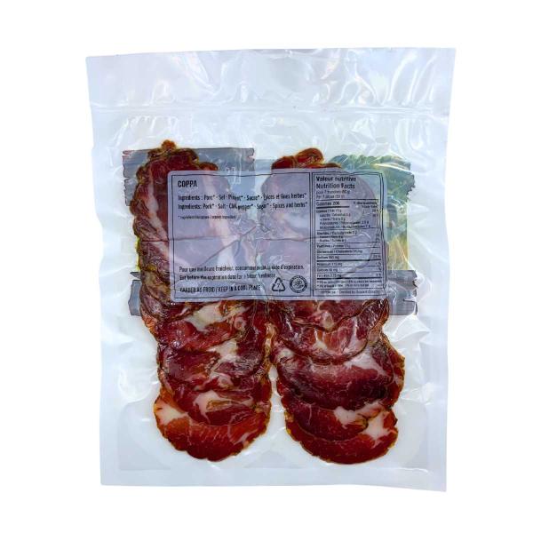 Une charcuterie fine au goût doux et persillé : cette coppa est séchée à partir de l’échine de porc (joli marbrage), assaisonnée avec parcimonie et affinée pour une texture fondante. Sans nitrite ajouté – la conservation se fait « naturellement » grâce à des extraits végétaux et antioxydants. Parfaite pour un plateau, une pizza blanche ou un sandwich gourmet.