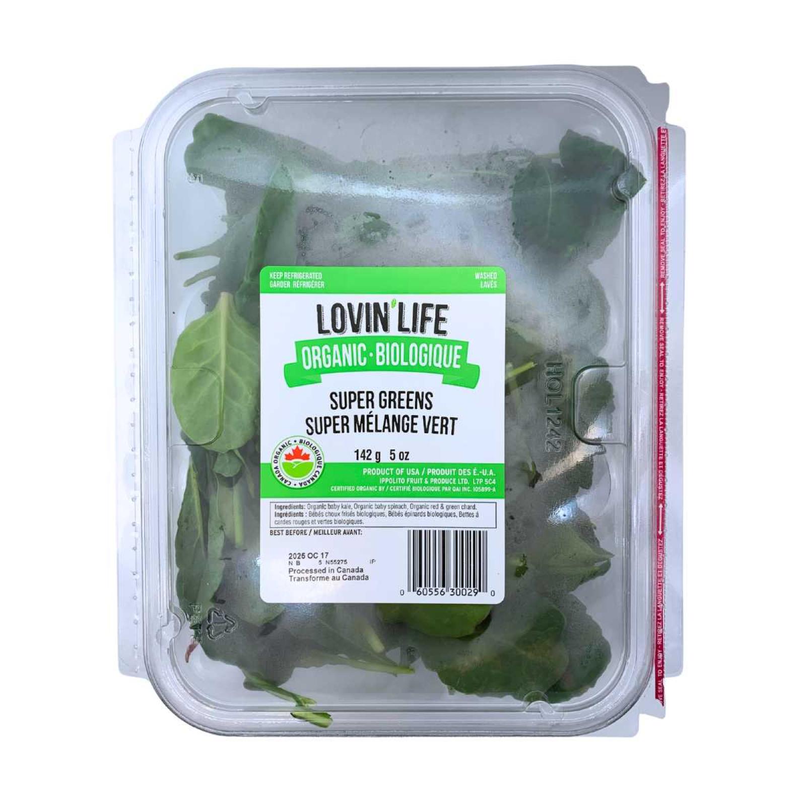 Mélange de jeunes verdures biologiques. La composition peut varier selon les récoltes; référez-vous à l’étiquette du lot pour le détail exact (ex. jeunes épinards, jeunes bettes, roquette, chou frisé, mizuna, tatsoï, etc.).
