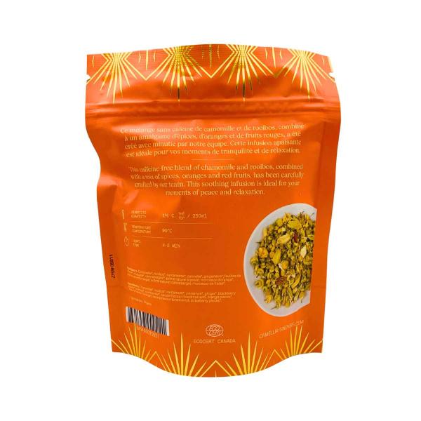 - Notes de dégustation : floral (camomille), fruité (orange, fraise, canneberge, cassis), épicé (cardamome, cannelle, muscade), fond doux et rond du rooibos.