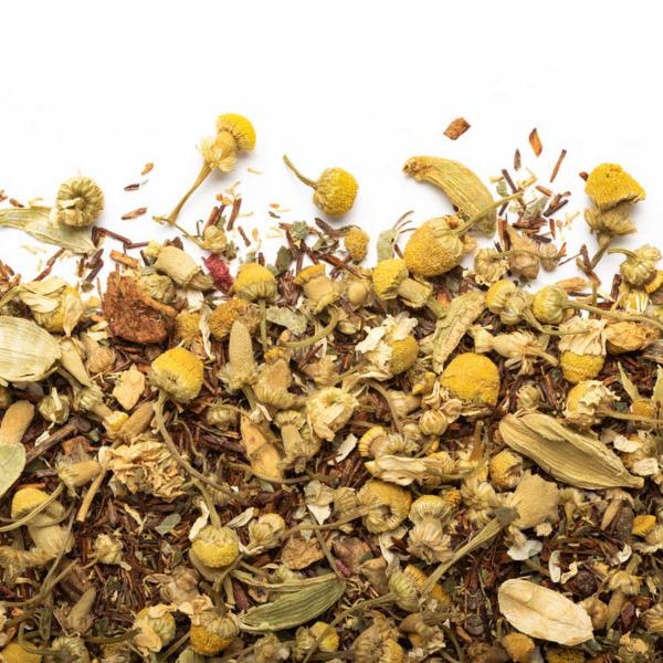 Un mélange réconfortant et sans caféine qui marie la douceur florale de la camomille au côté moelleux du rooibos, relevé d’épices chaleureuses, d’orange et de petits fruits. Profil aromatique dominé par des notes florales et fruitées, avec une touche épicée, un fond végétal/terreux tout en douceur—exactement la tasse qui appelle la couette et le fauteuil près du foyer.
