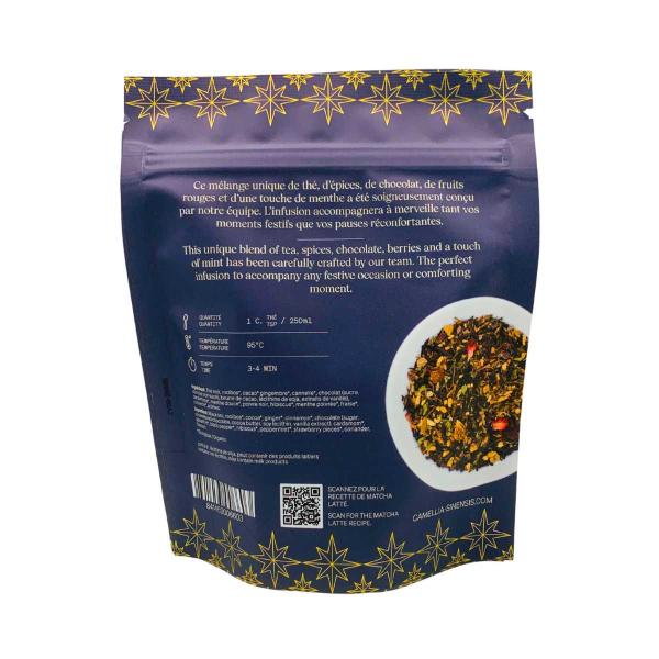 Le mariage épices-chocolat-thé évoque nos rituels d’hiver : souvenirs de cacao fumant, odeur de cannelle des marchés, petits fruits qui rappellent nos terroirs nordiques. Nuit Étoilée s’invite ainsi comme une boisson-plaisir de saison, à partager lors des veillées et des retrouvailles.