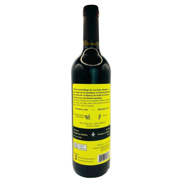 - Assemblage : Frontenac noir + Maréchal Foch — deux variétés parfaitement adaptées au climat frais québécois.