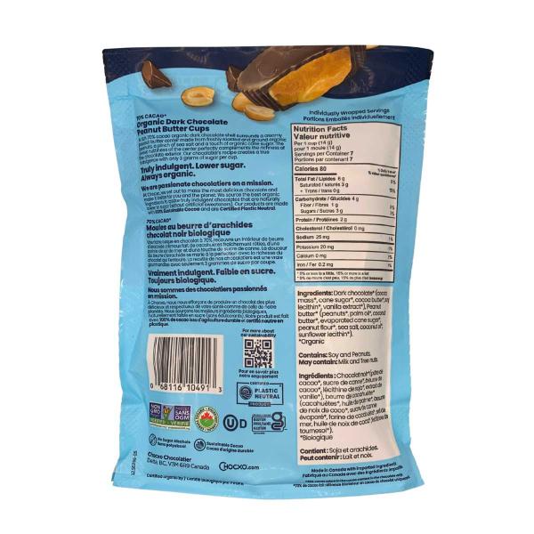 Ces coupelles signées Chocxo marient l’intensité d’un chocolat noir biologique à 70 % de cacao avec la richesse d’un beurre d’arachides crémeux, entièrement élaboré à partir d’ingrédients biologiques. Chaque bouchée propose un contraste parfaitement équilibré : une coque de chocolat noir cassante, suivie d’un cœur onctueux, légèrement salé et naturellement aromatique.