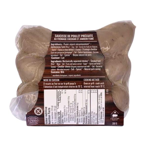 Poulet séparé mécaniquement*, jambonneau fumé (porc)* (eau, sel, extrait de fruits et épices, sucre, épices et fines herbes, fumé), fromage cheddar* (lait biologique, culture bactérienne, enzyme), sel, épices, boyau naturel de porc.