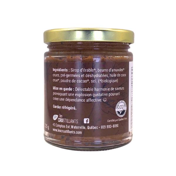 Sirop d’érable*, beurre d’amandes* (crues, pré-germées et déshydratées), huile de coco crue*, poudre de cacao*, sel. (*biologique)