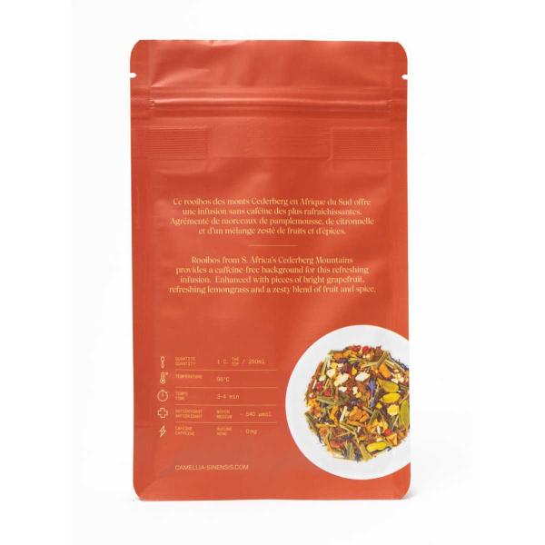 - En bouche : sensation « éclat d’agrume », rondeur douce du rooibos, finale propre et désaltérante.
