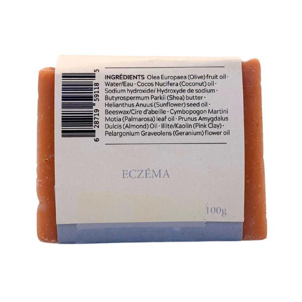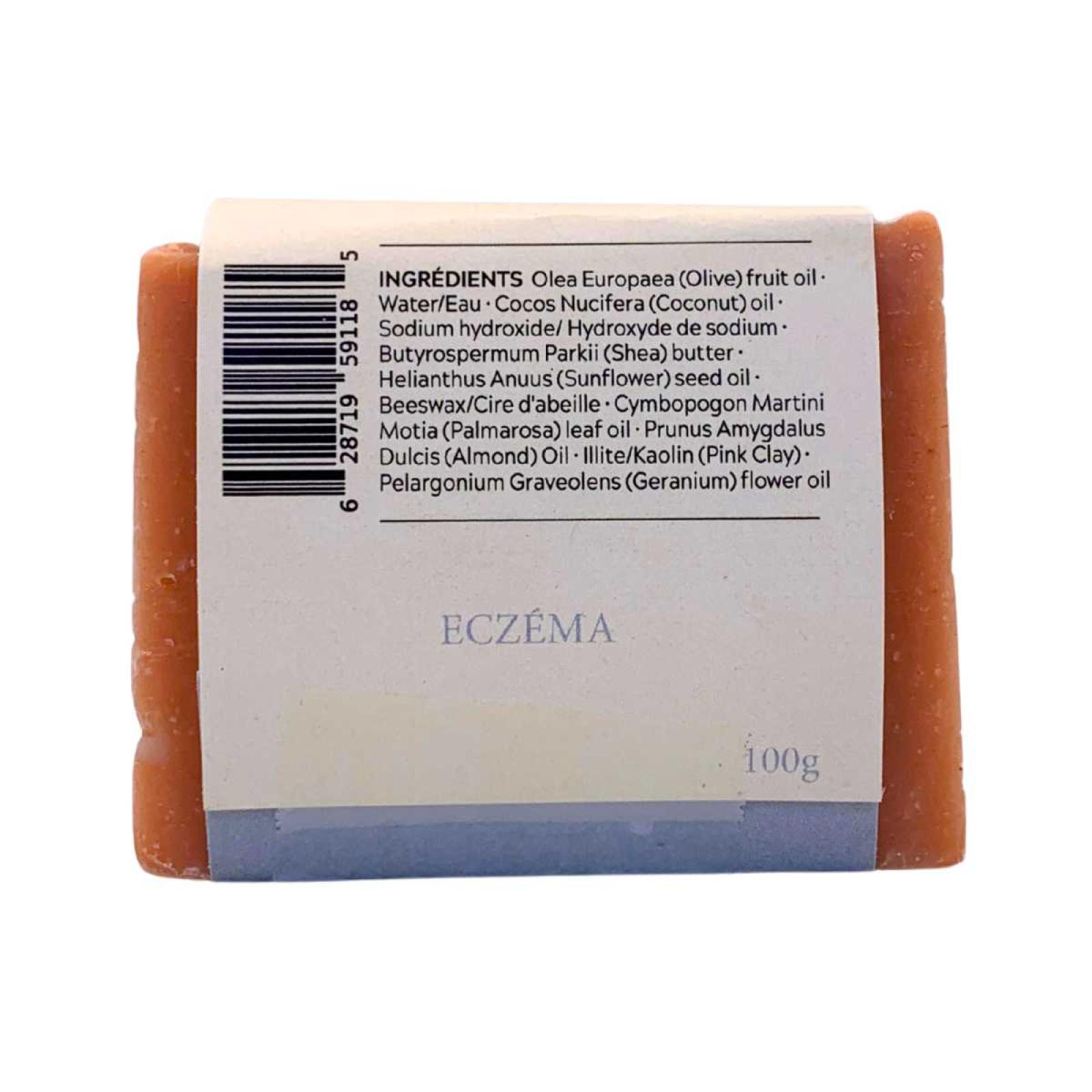 Ingrédients (tels qu’indiqués) : huiles saponifiées (olive, noix de coco, beurre de karité, tournesol, cire d’abeille), argile rose, huile d’amande, huiles essentielles (palmarosa, géranium), vitamine E.