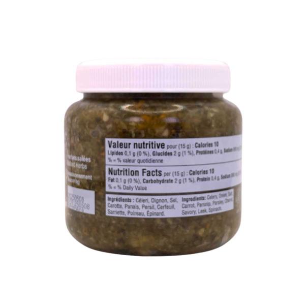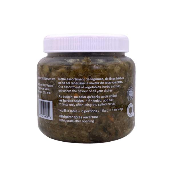 Un condiment québécois culte : un hachis de légumes et fines herbes conservés au sel qui remplace avantageusement le sel de table. Une simple cuillère à soupe parfume soupes, œufs, pommes de terre, mijotés, poissons et plats végétariens.