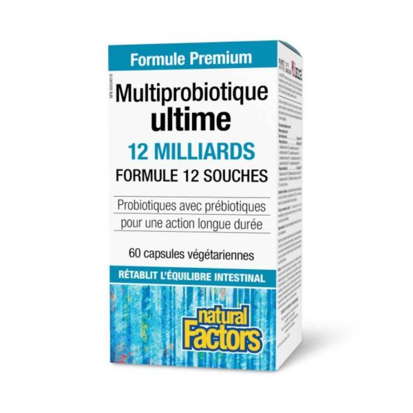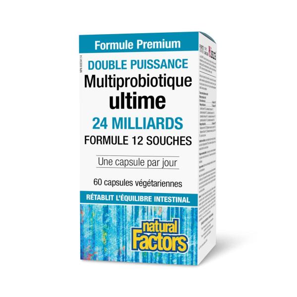 Le Multiprobiotique ultime Double puissance 24 milliards de Natural Factors offre le double de la concentration de la formule originale, avec 24 milliards de cellules actives par capsule réparties en 12 souches probiotiques. Cette version à haute puissance combine un mélange lacto-probiotique de 17,76 milliards d'UFC et un mélange bifido-probiotique de 6,24 milliards d'UFC pour un soutien intensif du microbiome intestinal.