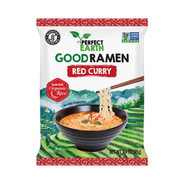 Un bol de ramen instantané aux saveurs vibrantes du curry rouge thaïlandais. Le Good Ramen Curry Rouge de Perfect Earth marie des nouilles de riz biologique à un bouillon épicé, frais et crémeux, fidèle à la tradition culinaire du centre de la Thaïlande.