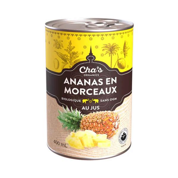 Les ananas sont cultivés sur des fermes biologiques en régions tropicales et mis en conserve selon des standards rigoureux. Cha's Organics opère depuis Montréal (3700 rue St-Patrick) et importe directement de ses partenaires agricoles, sans intermédiaires superflus.
