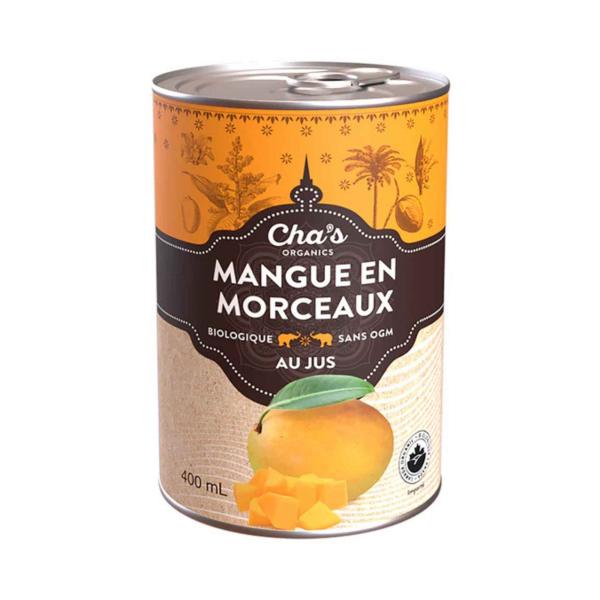 Les mangues sont cultivées sur des fermes biologiques en régions tropicales et mises en conserve avec soin. Cha's Organics opère depuis Montréal (3700 rue St-Patrick) et importe directement de ses partenaires agricoles, assurant traçabilité et équité du producteur au consommateur.