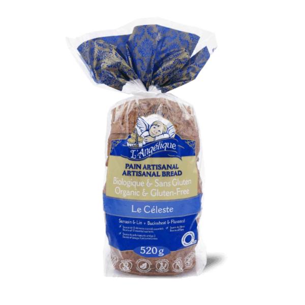Le Céleste de Cuisine L'Angélique est un pain artisanal sans gluten biologique à base de sarrasin et de graines de lin moulues. Recommandé par le magazine Protégez-Vous, ce pain surgelé offre une texture moelleuse et un goût riche qui rivalisent avec les meilleurs pains de boulangerie traditionnels. Chaque tranche décongelée retrouve la fraîcheur d'un pain tout juste sorti du four.