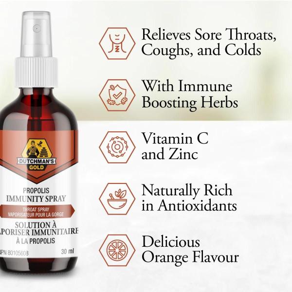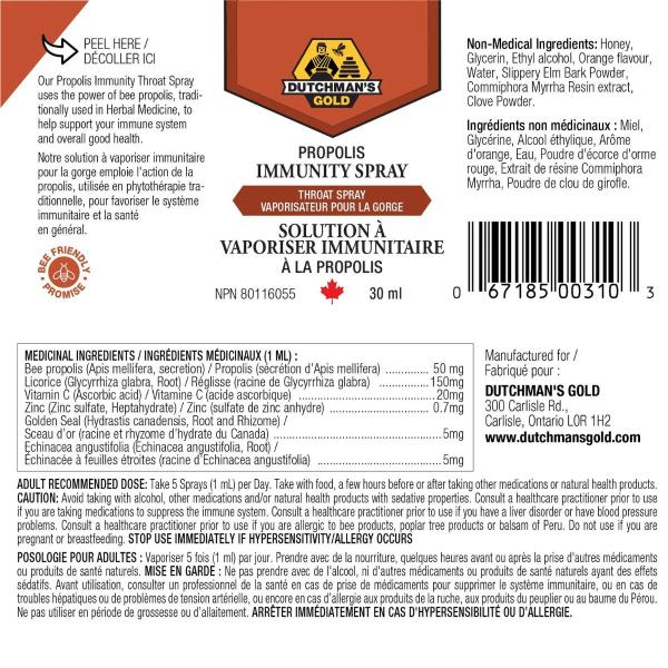 Ingrédients médicinaux (1 ml) : Propolis d'abeille 50 mg, racine de réglisse 150 mg, vitamine C 20 mg, zinc 0,7 mg, racine d'hydraste du Canada 5 mg, échinacée 5 mg.